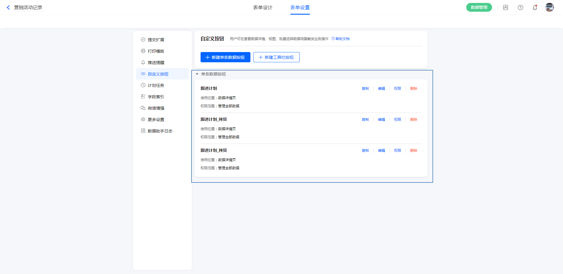 表单设置->自定义按钮->新建自定义按钮,可选择设置 单条数据按钮 或者 工具栏按钮。