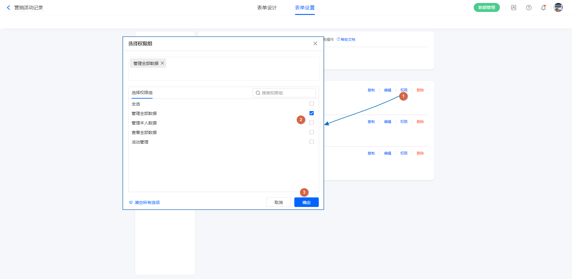 调整按钮使用的权限组:点击某一按钮后的「权限」,并选择需要使用该按钮的权限组,设置完成后点击「确定」。