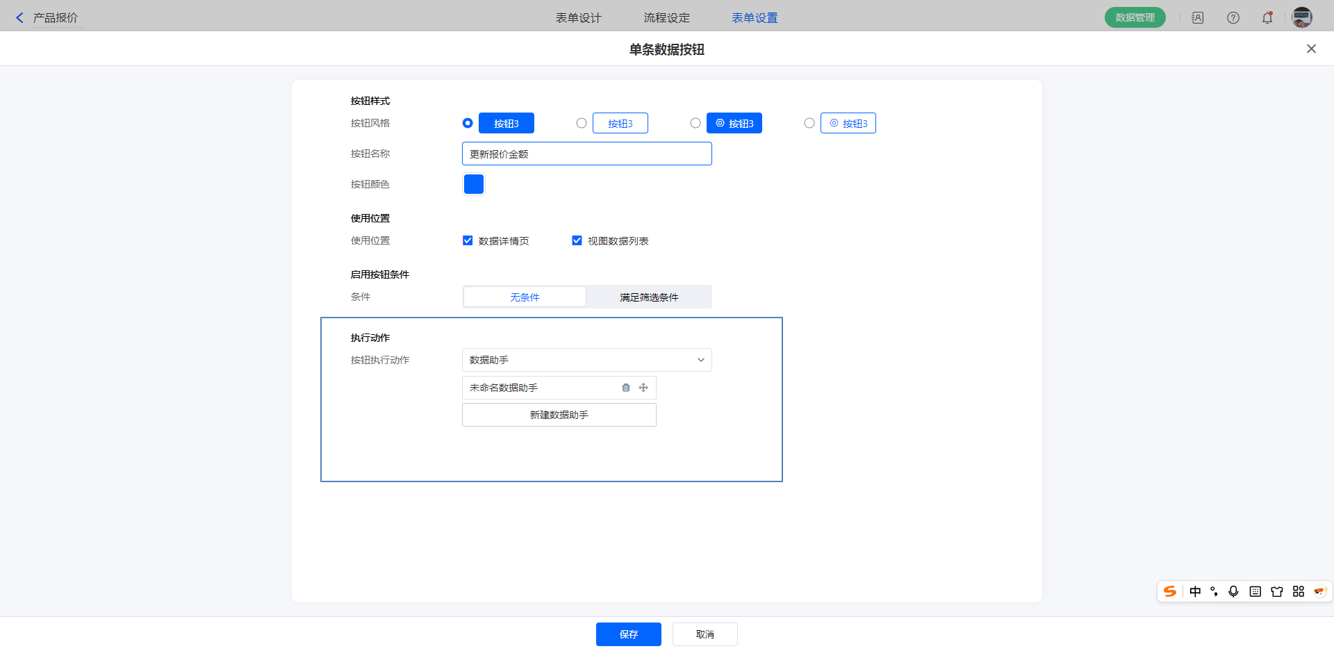 1)新建自定义按钮,配置好各项属性,执行动作选择:数据助手。
