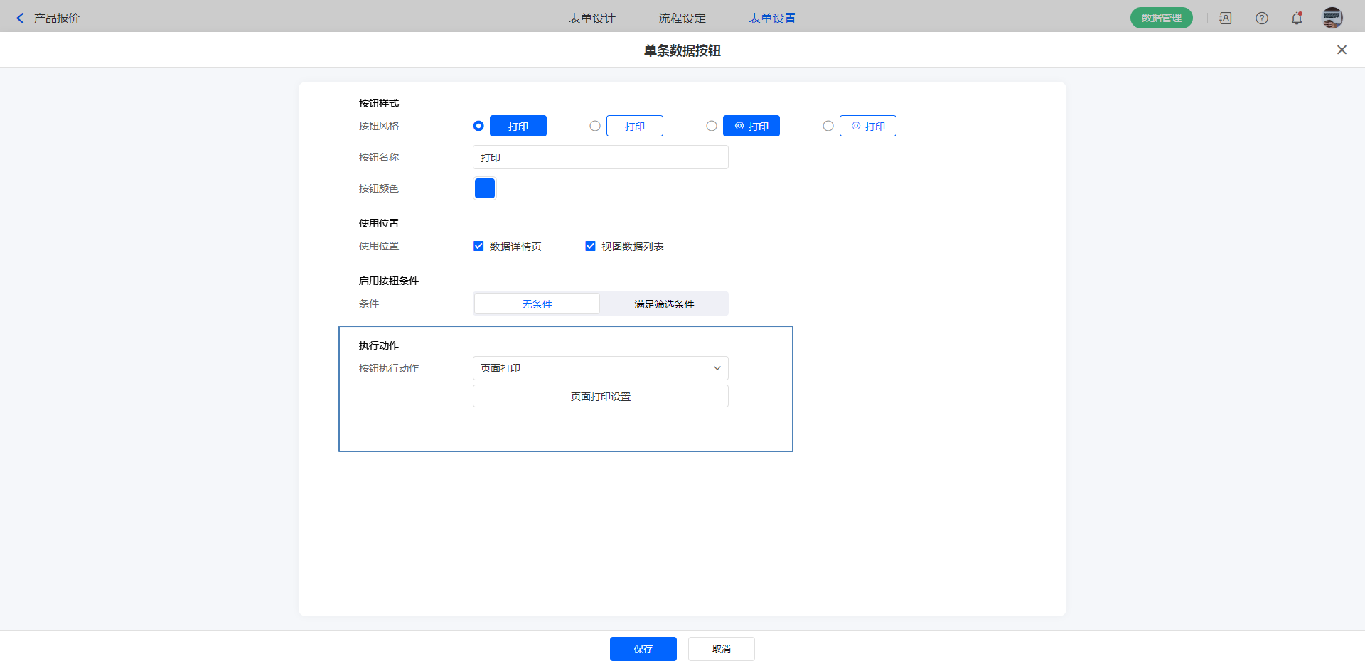 1)新建自定义按钮,配置好各项属性,执行动作选择:打印。