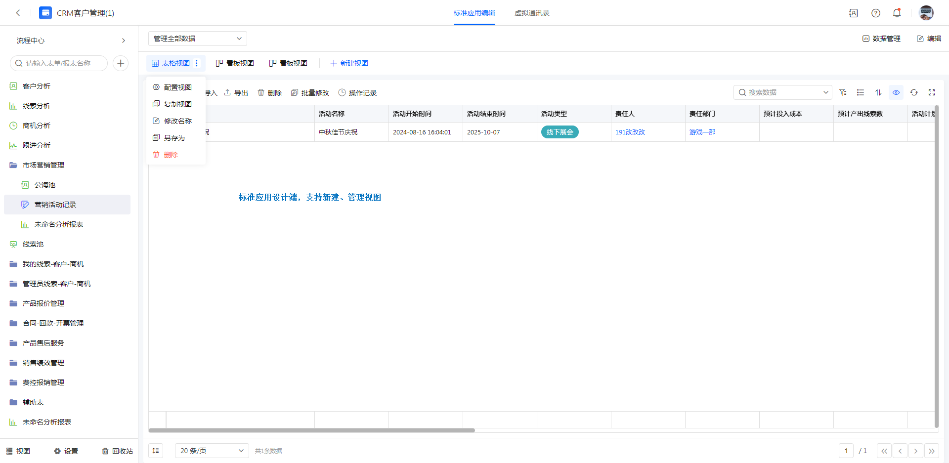 标准应用设计端,支持新建公共视图/个人视图,以及配置视图等。