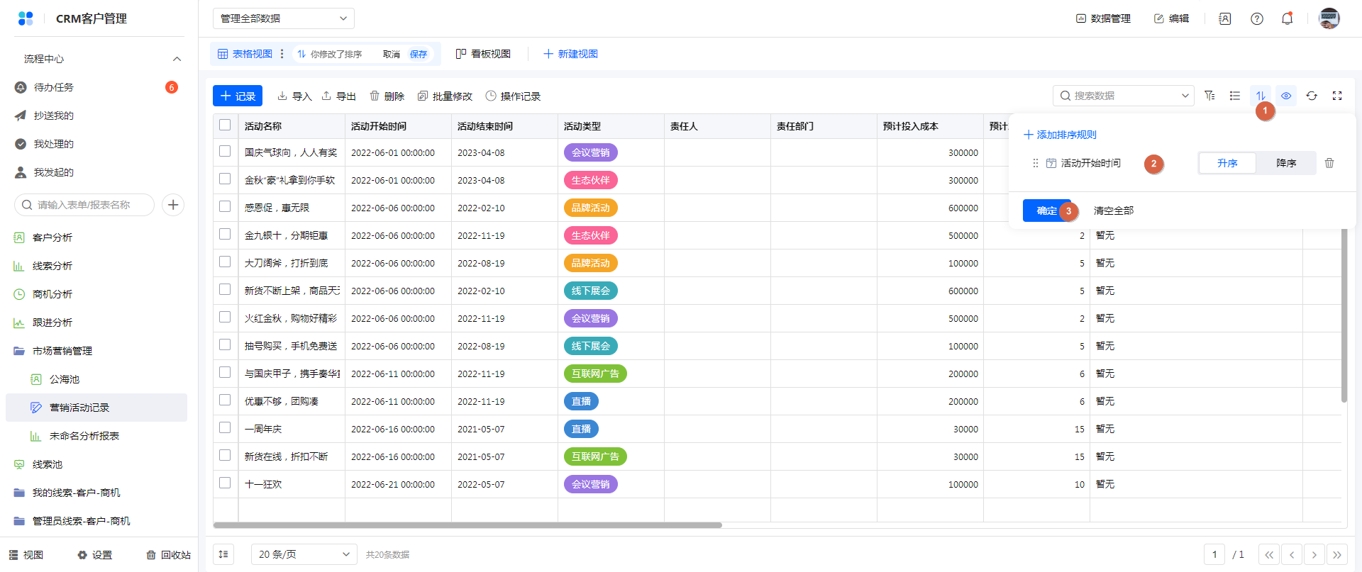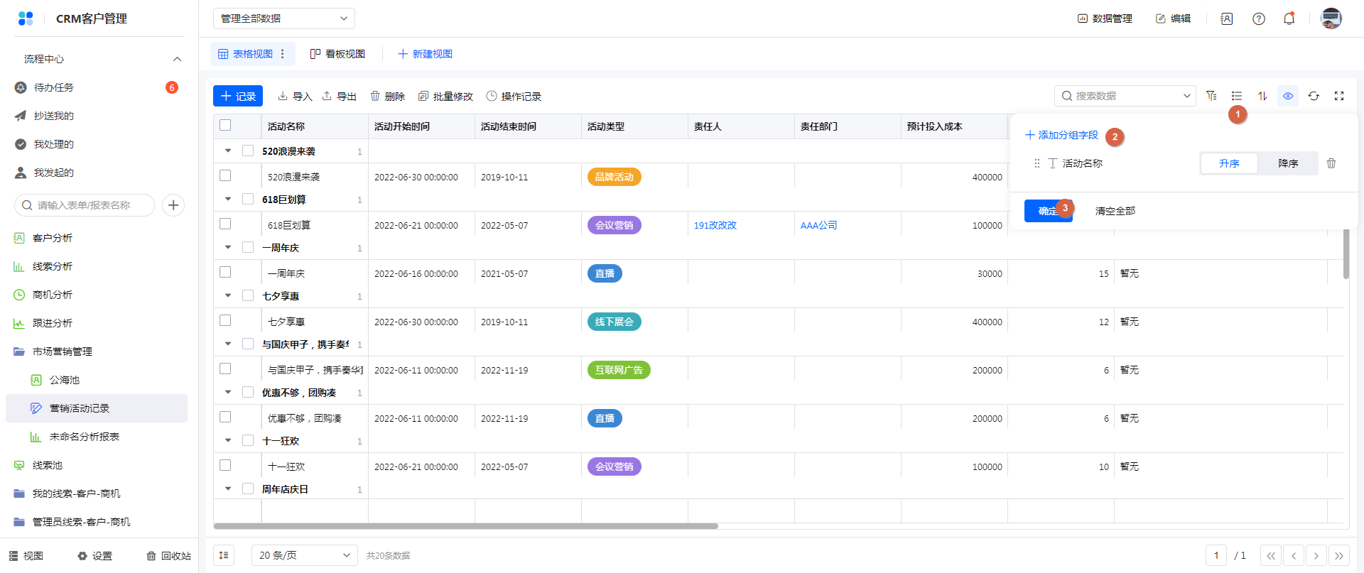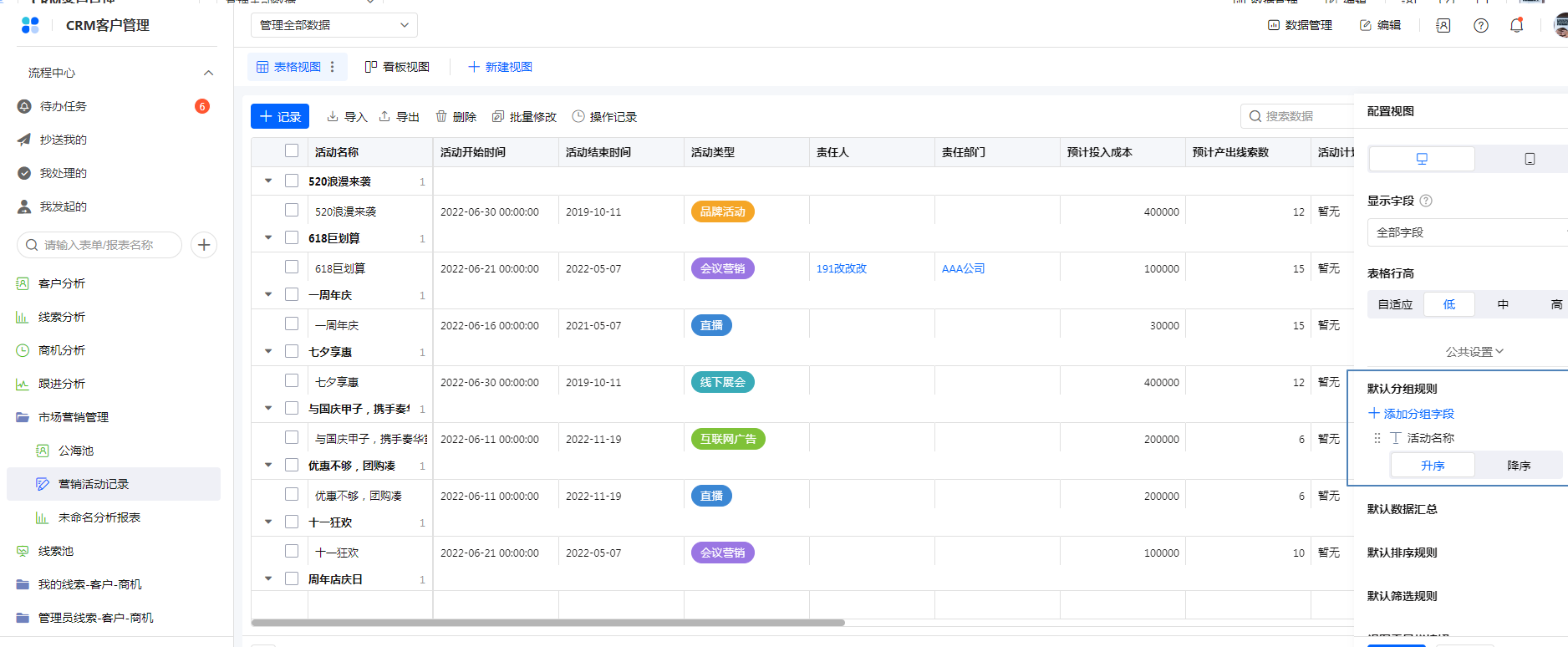 - 成员单选、提交人、部门单选字段类型,排序规则是 按相同值排序;其他字段类型排序规则:升序/降序。