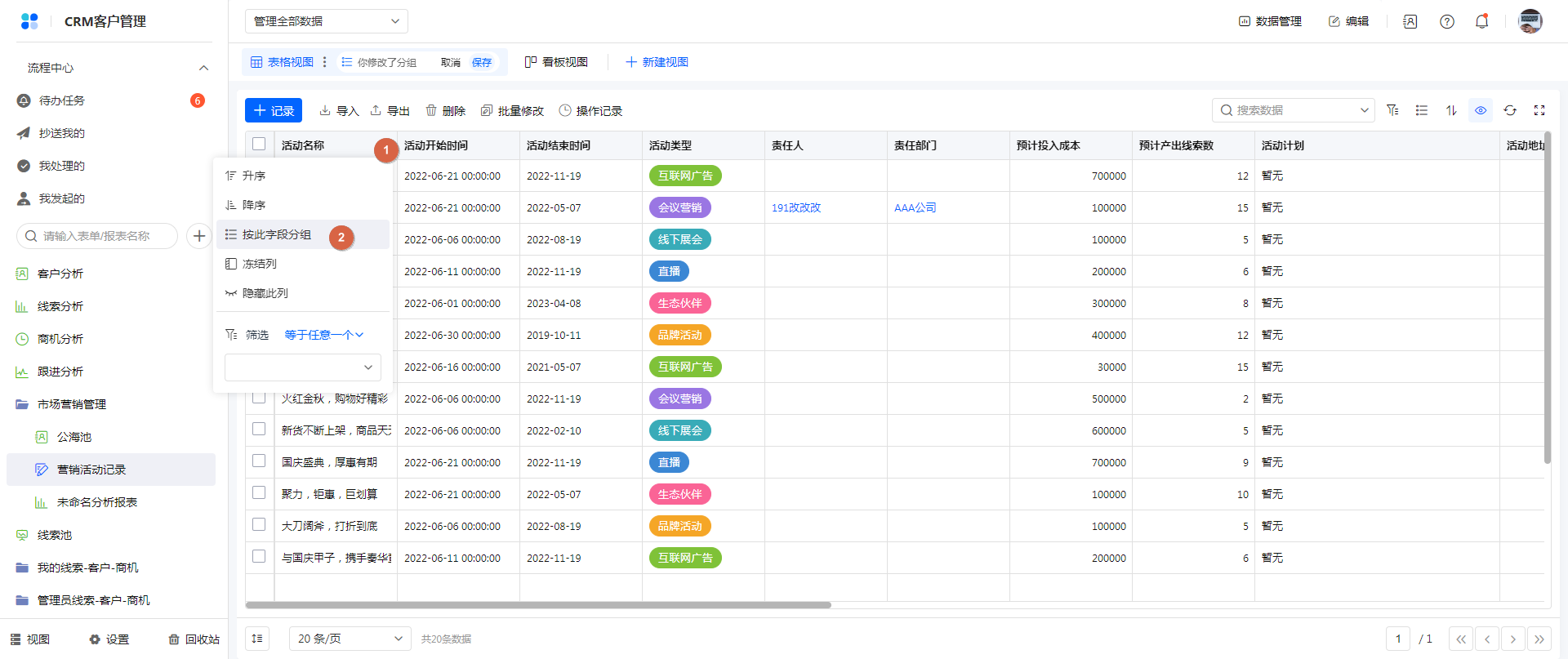 方式三:权限组访问时,表格表头字段右侧菜单,按此字段分组/取消分组。