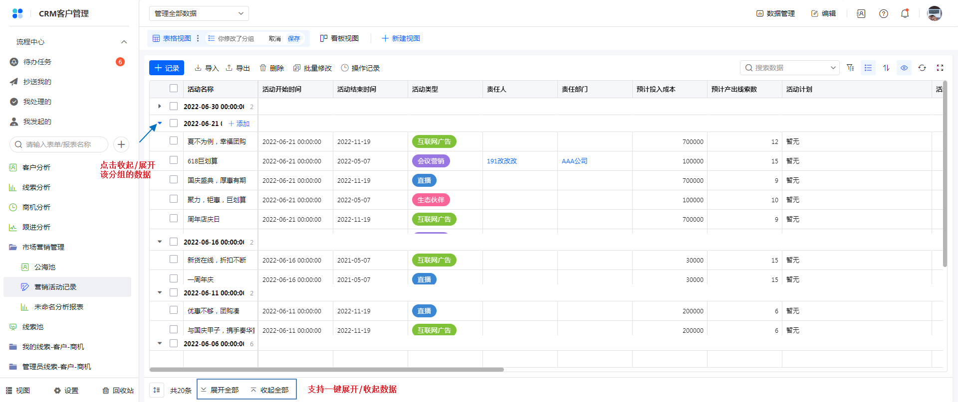 表格视图设置分组规则后,权限组访问时,支持对分组及数据展开/收齐