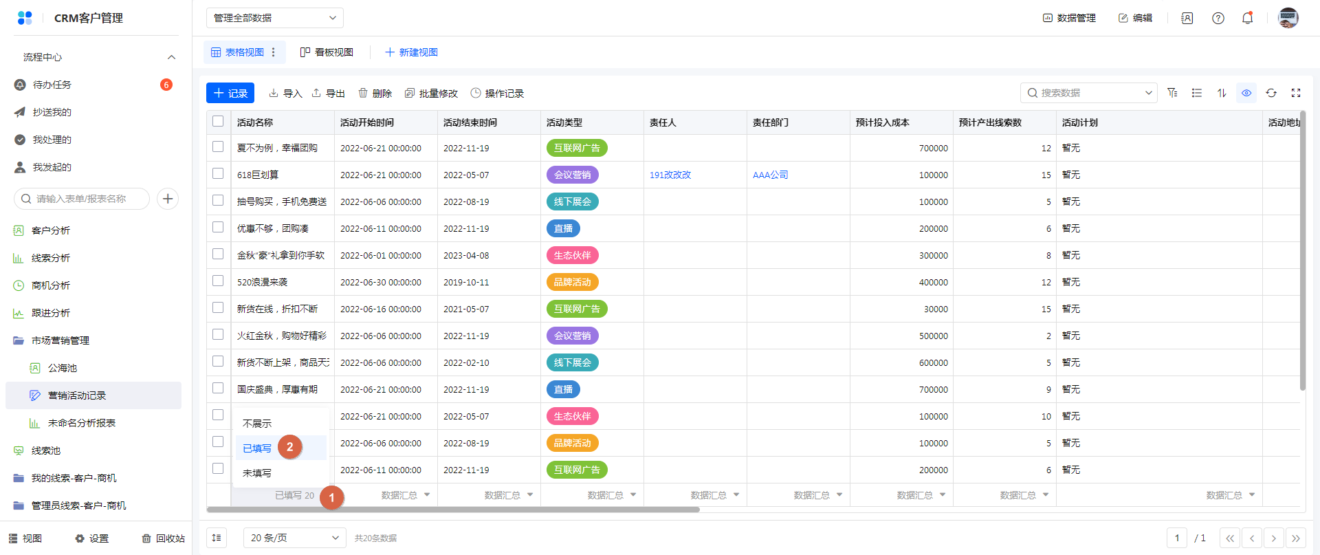 数据汇总支持统计数据列的已填写和未填写数量,同时支持对数据列进行求和、平均值、最大/最小值、计数等汇总统计。