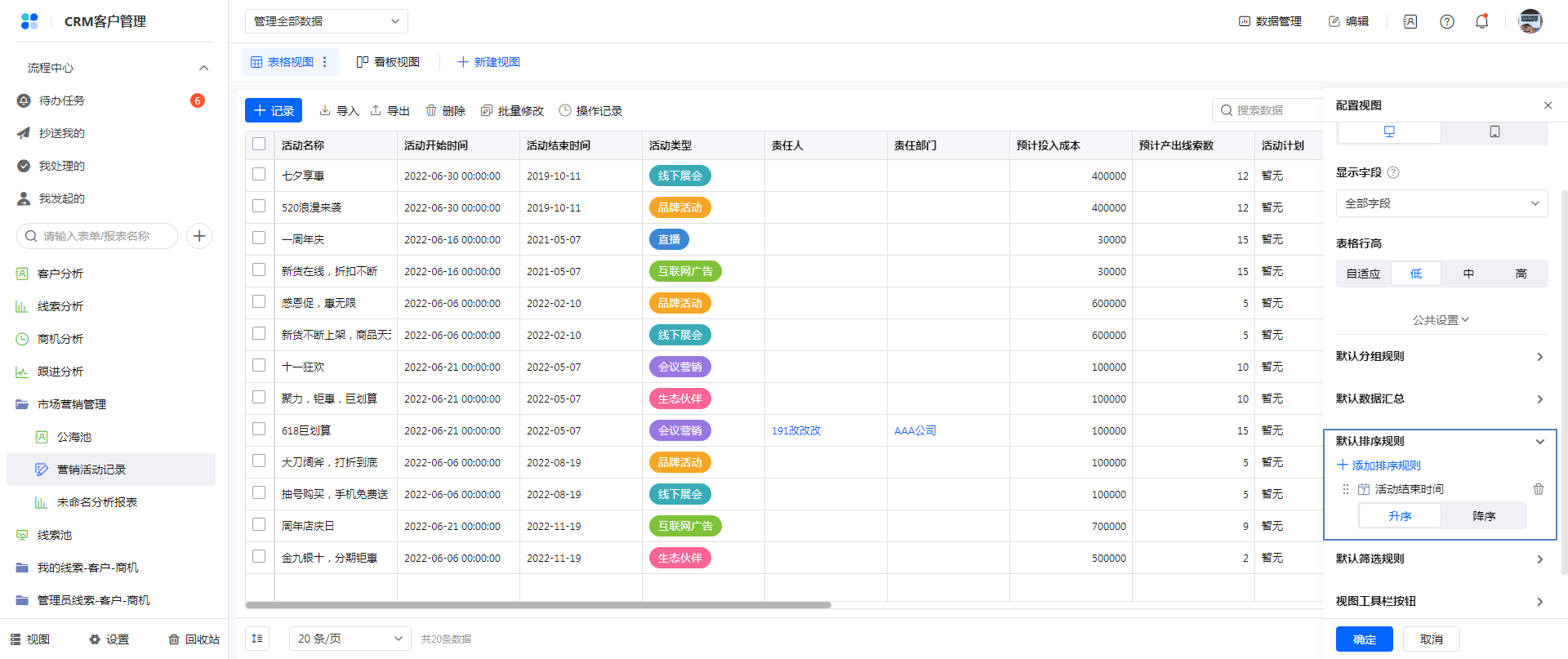 方式一:通过视图配置页修改排序字段。