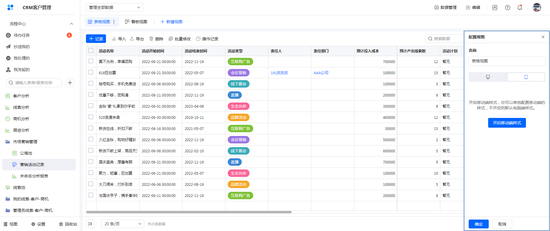 新建视图后,视图右侧操作菜单,点击配置,弹出视图配置弹窗,切换到移动端。