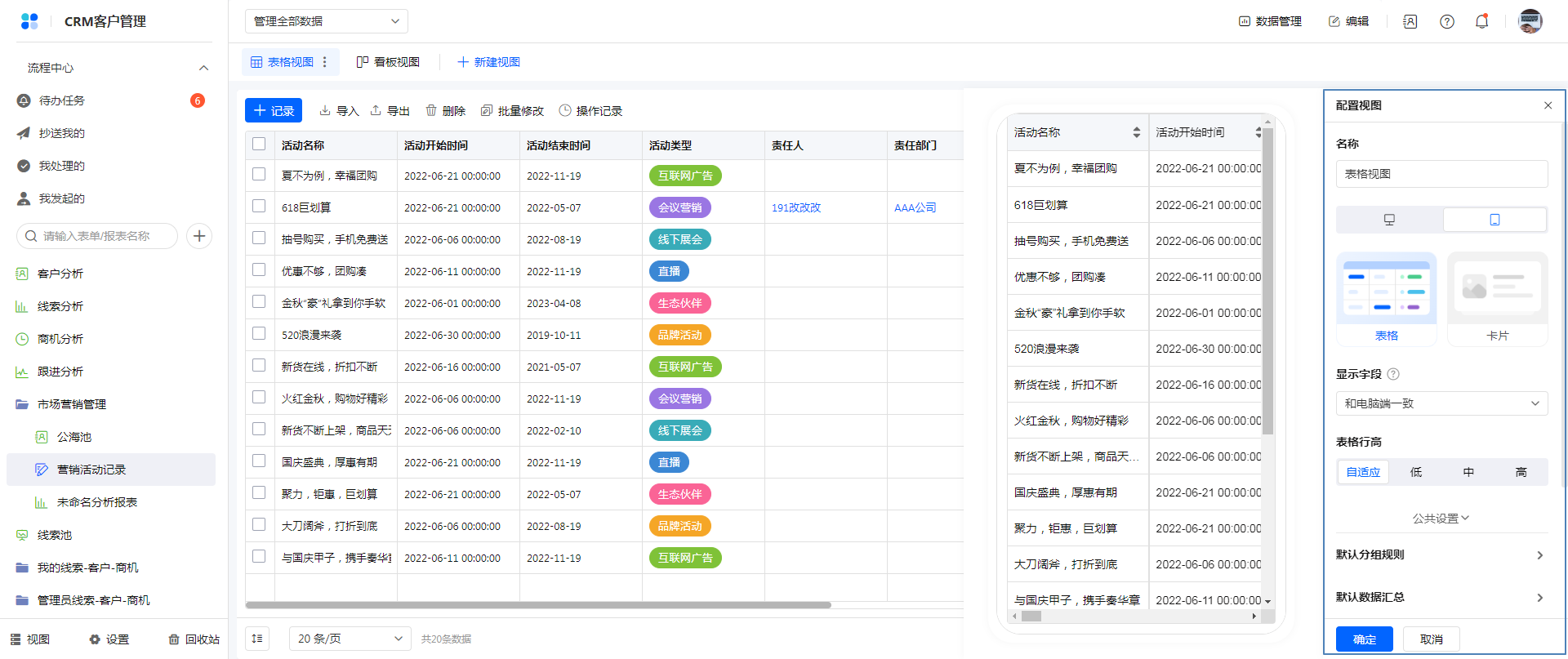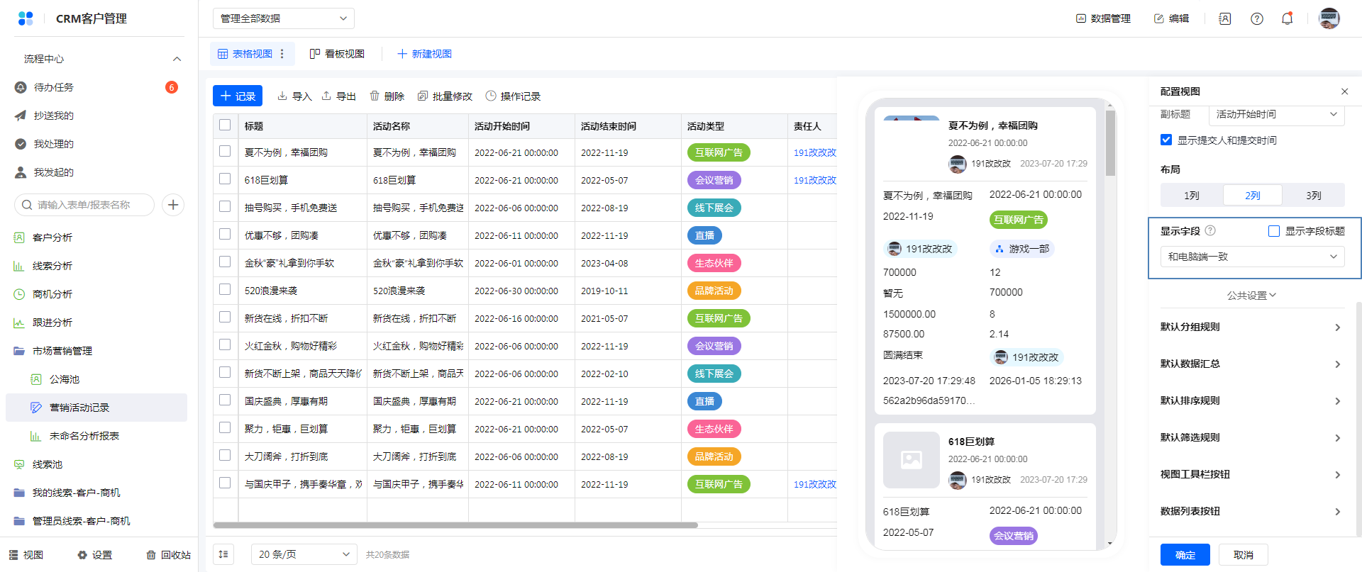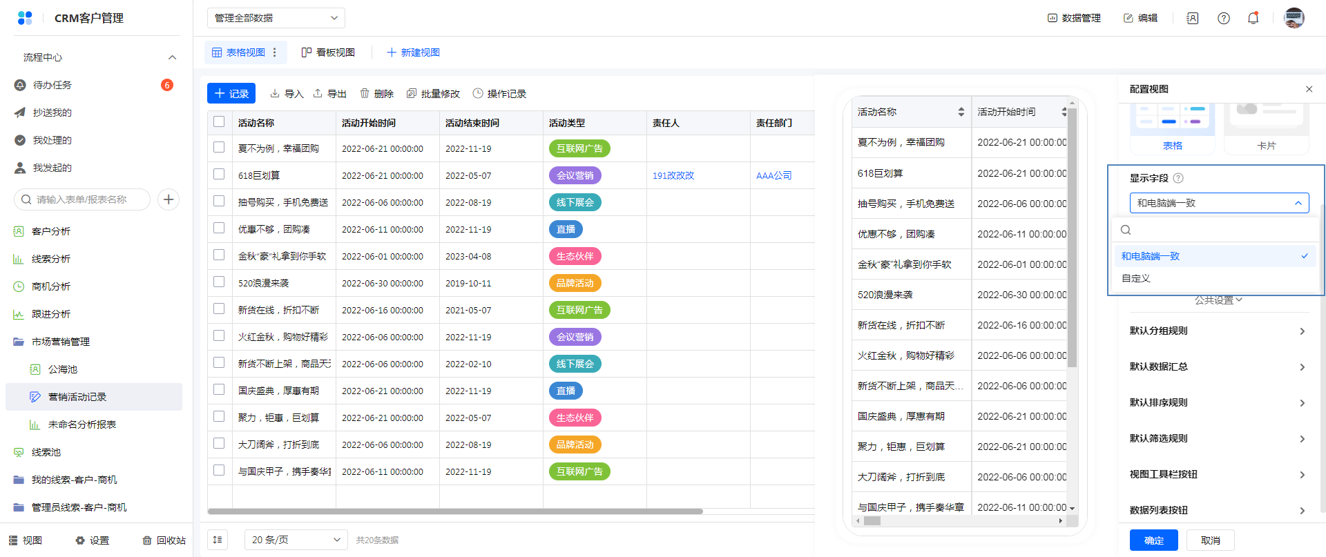 - 移动端进行排序、显示字段、筛选条件、表格行高等操作后,记录会缓存在浏览器上,下次访问时会优先读取缓存,如果是首次访问或者无缓存的情况下,根据视图配置显示视图。