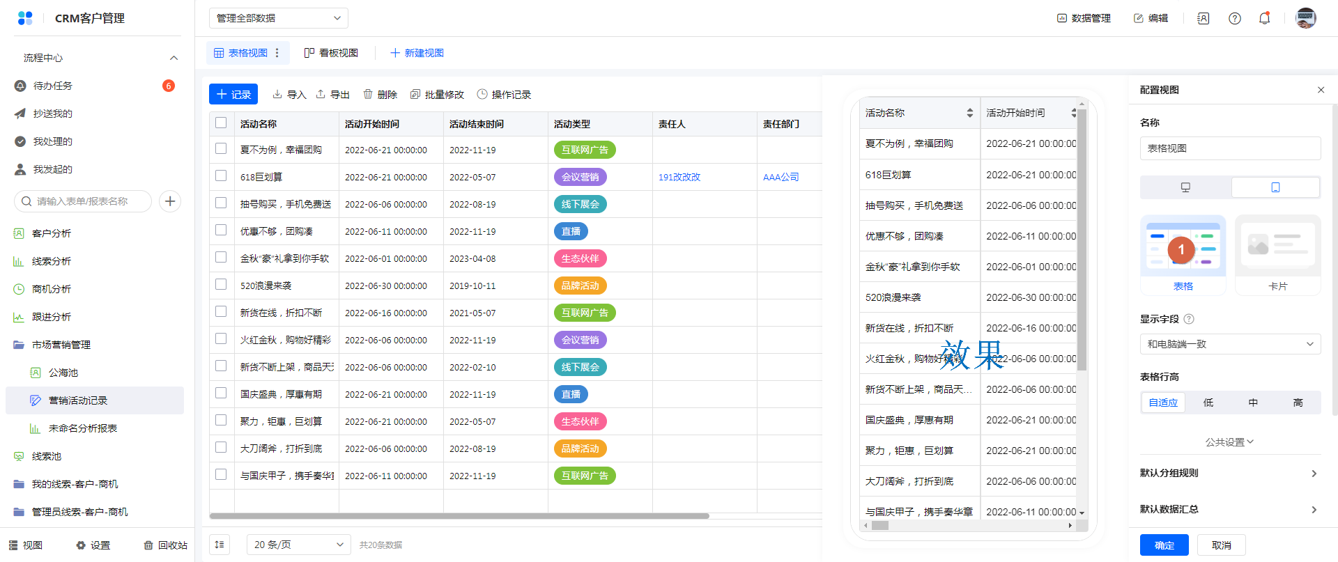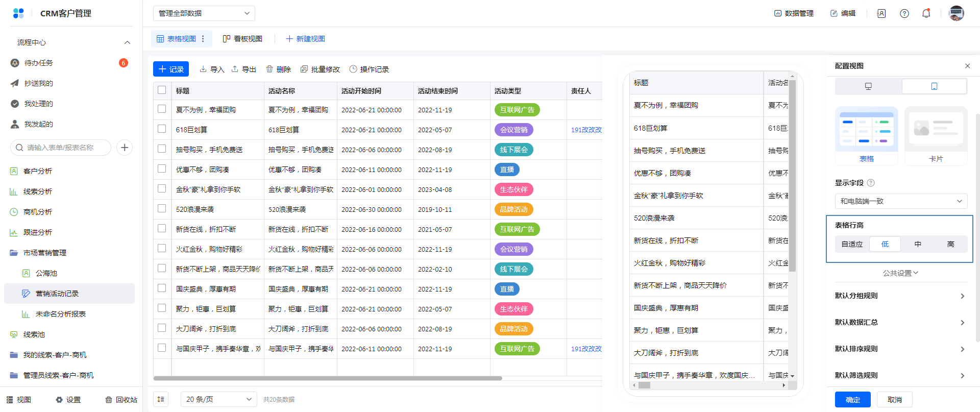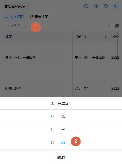 移动端表格视图样式支持自适应、低、中、高 4 种行高样式,在左侧预览界面可以看到预期效果:
