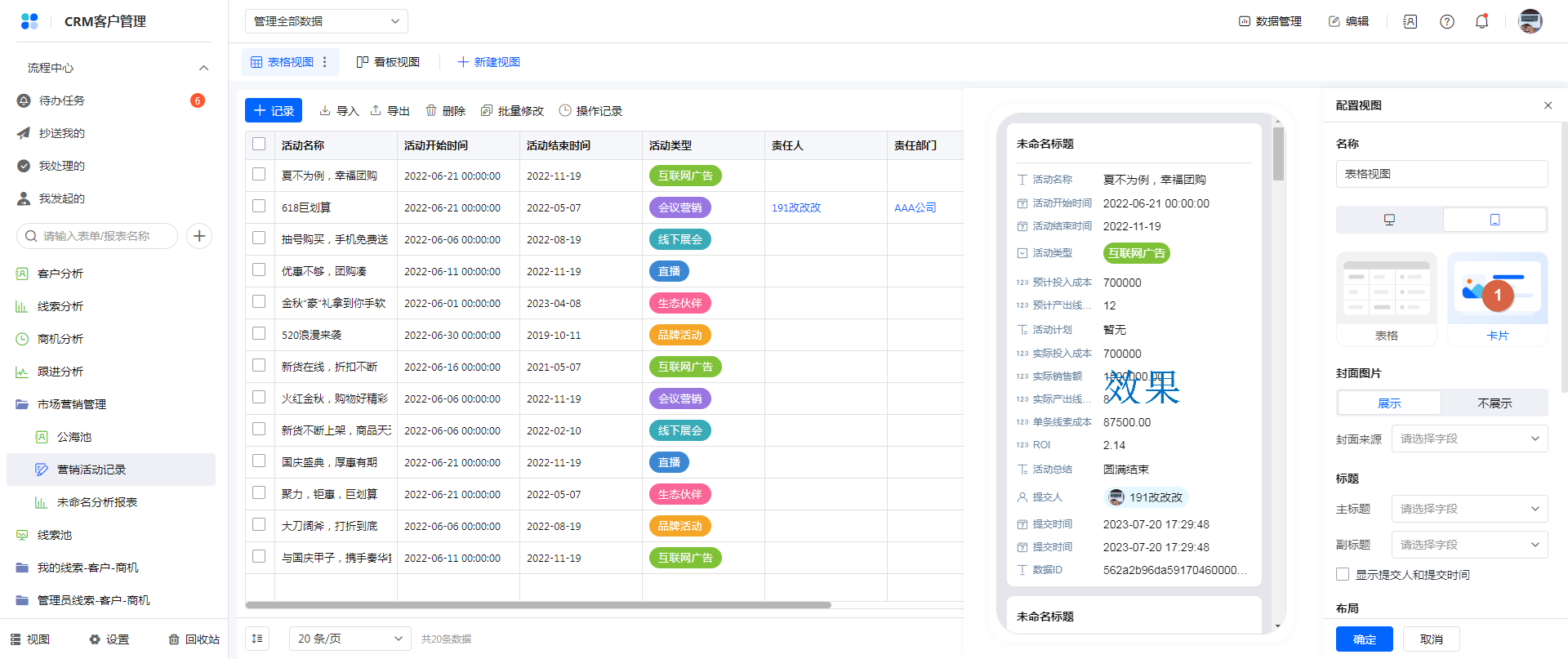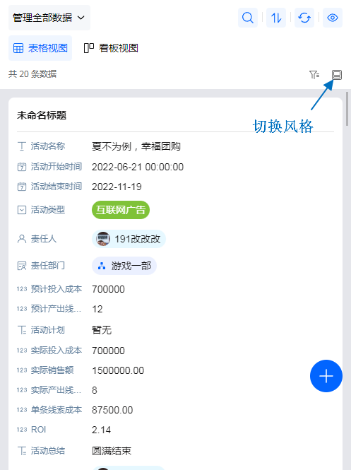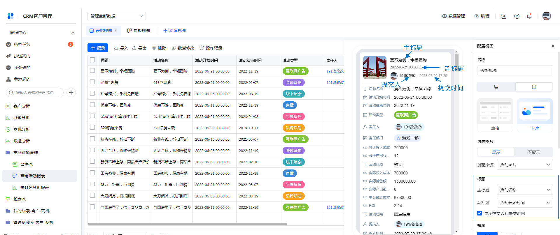 移动端表格视图 卡片样式时,支持设置 标题字段,分为主标题和副标题,在数据卡片上方显示标题字段。