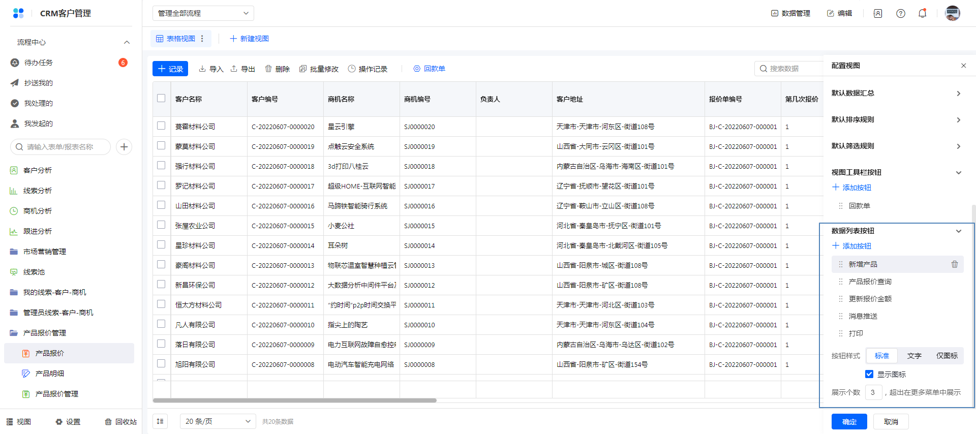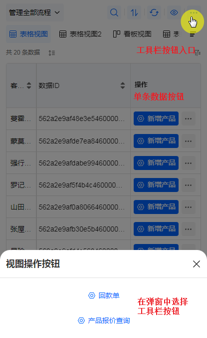 操作方式:视图配置页设置数据列表栏按钮。