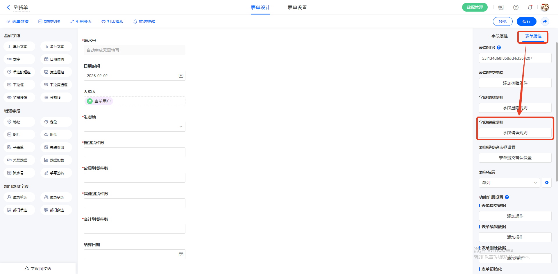 - 普通字段:表单设计-表单属性-字段编辑规则
