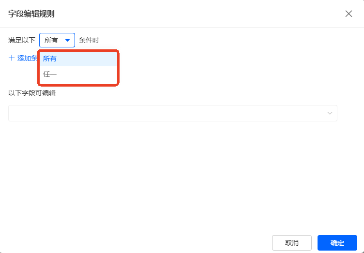 - 所有:所有条件必须同时满足才能编辑后续字段。
