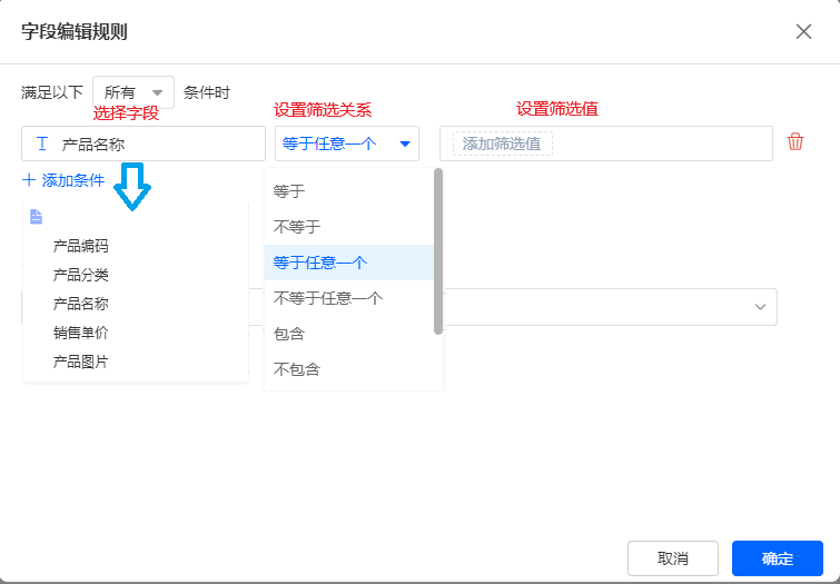 - 任意一个:满足其中任意一个条件即可编辑后续字段。