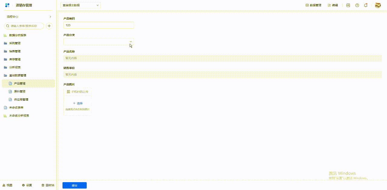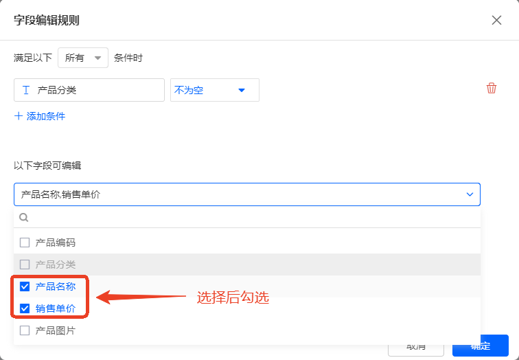 - 当【产品分类】选择[不为空]时,可以编辑【产品名称】、【销售单价】字段