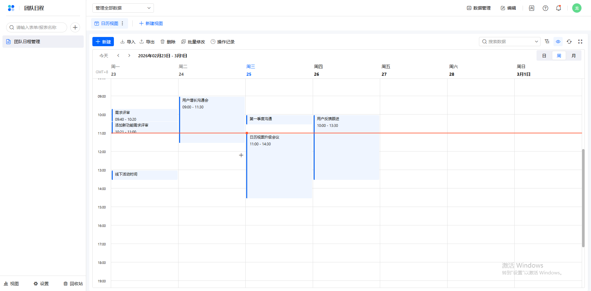 可以在表格使用日历视图管理日程。日历视图支持日、周、月三个时间展示维度,可以便捷地在日历上添加和管理日程,还可以自定义日程中展示的信息和日程样式。