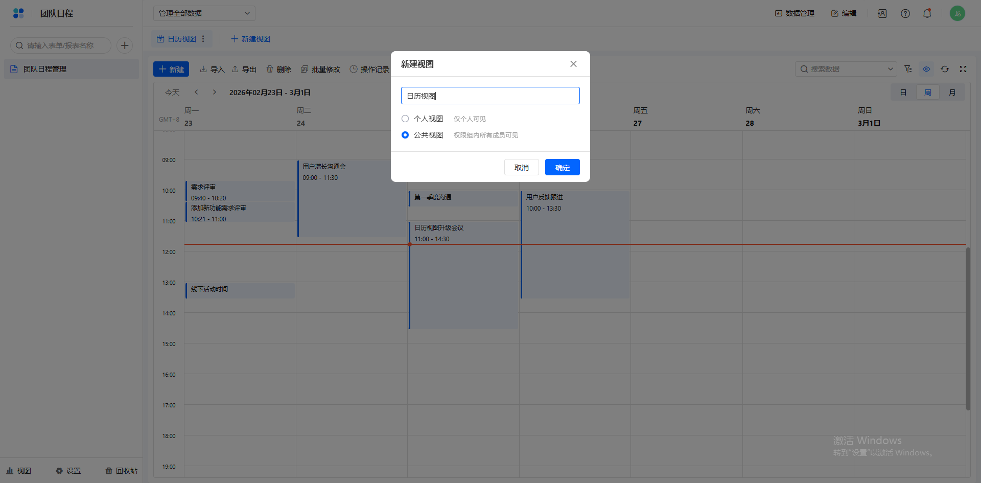 管理员如果拥有表单管理数据的权限,打开一个数据表,点击数据表上方的 + 新建视图 或 + 图标 选择 日历视图。设置显示字段和两个日期字段作为日程的开始和结束时间;