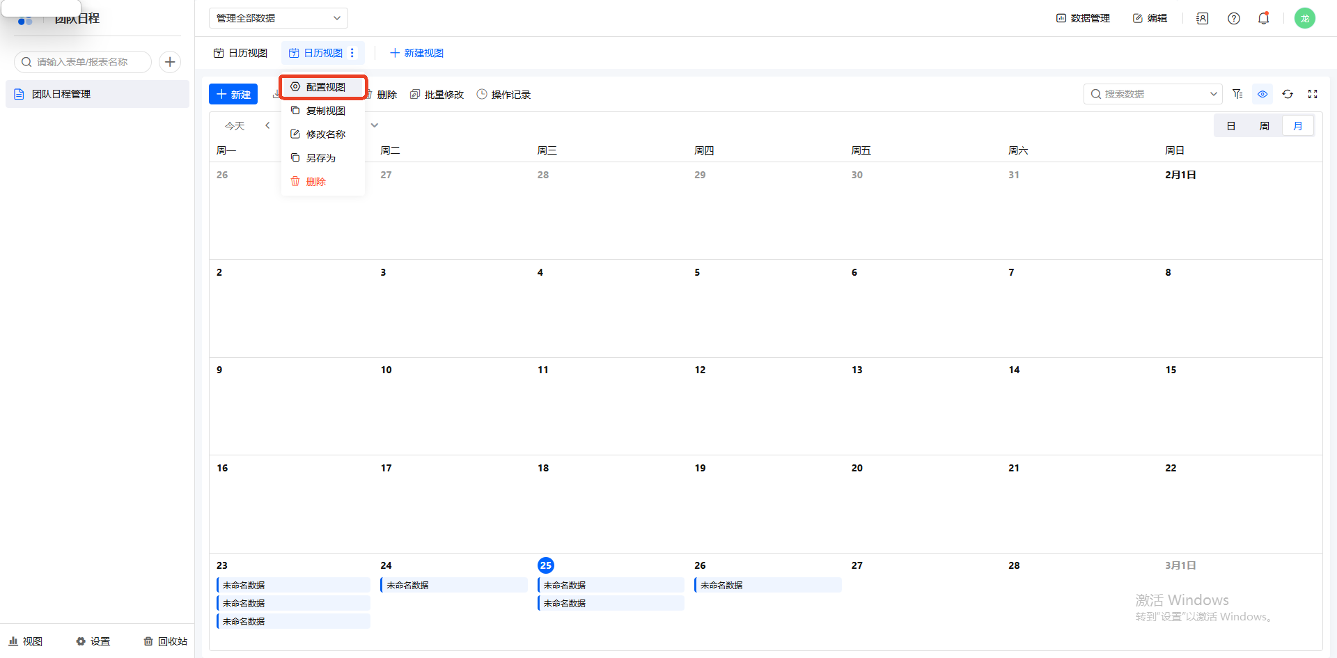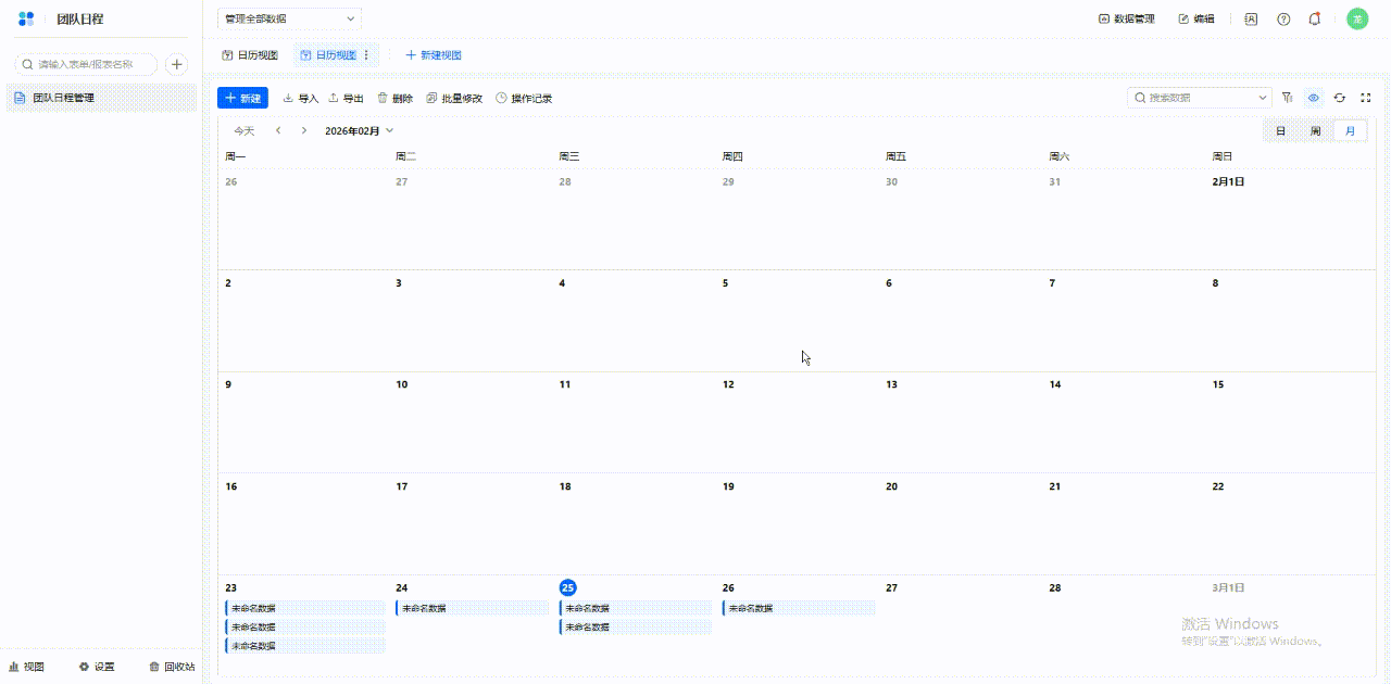 操作前提:日历日程中可展示哪些信息取决于数据表中的字段,因此在配置日历视图前,你需要先在数据表中创建需要的字段。