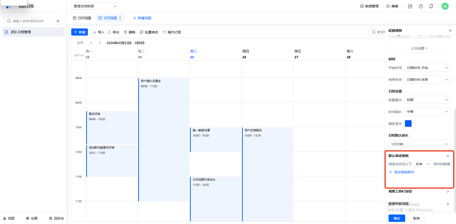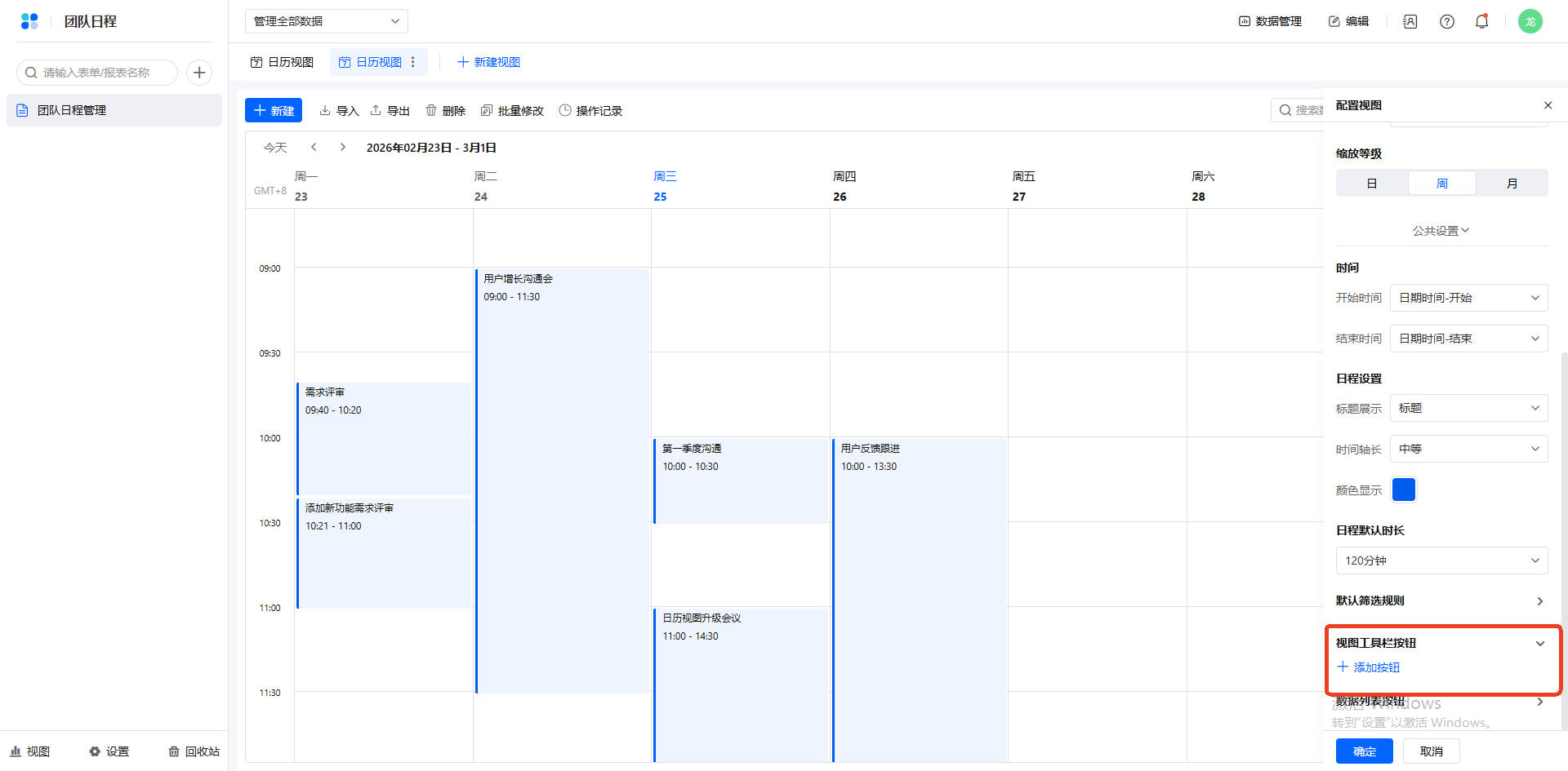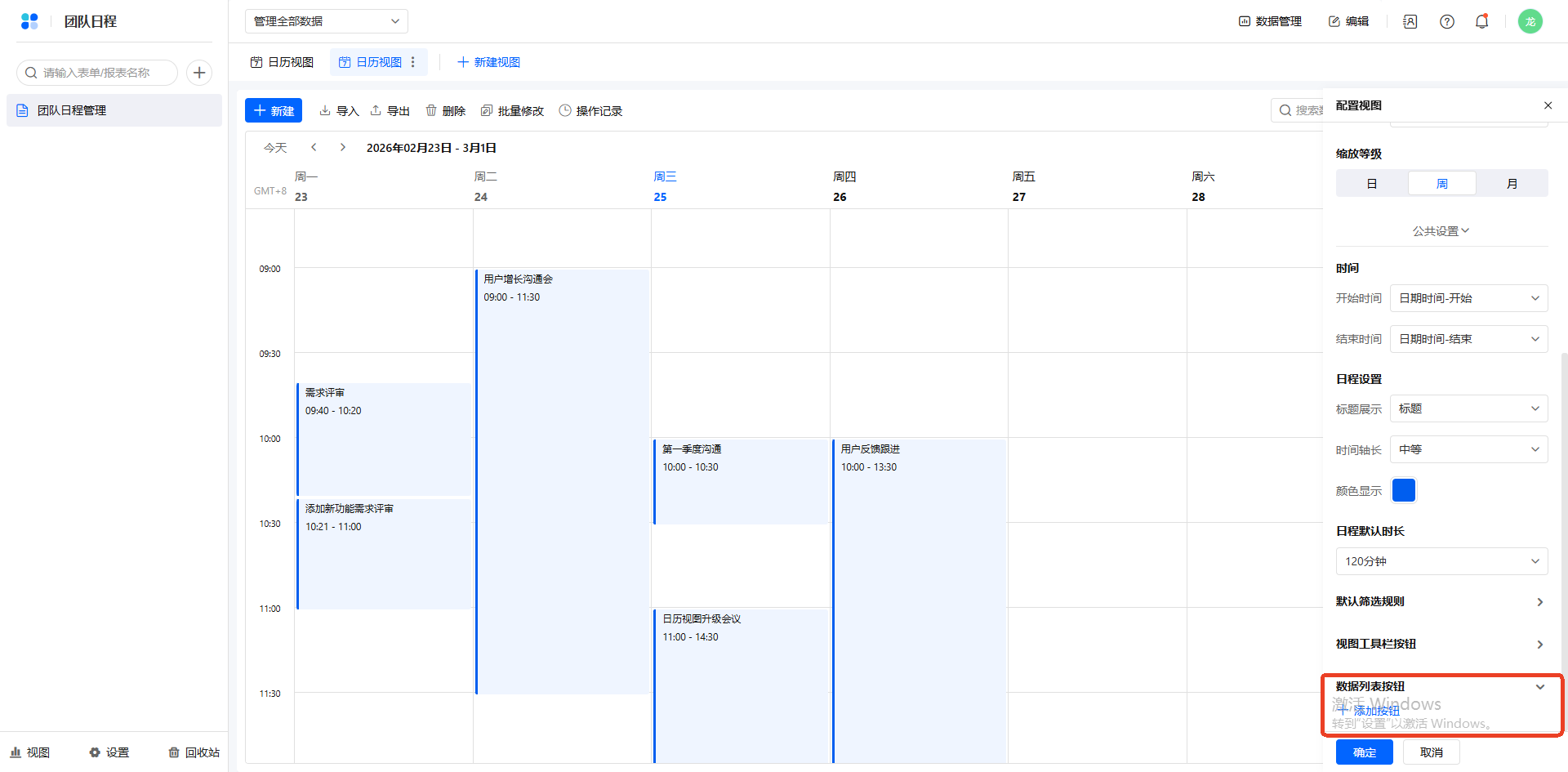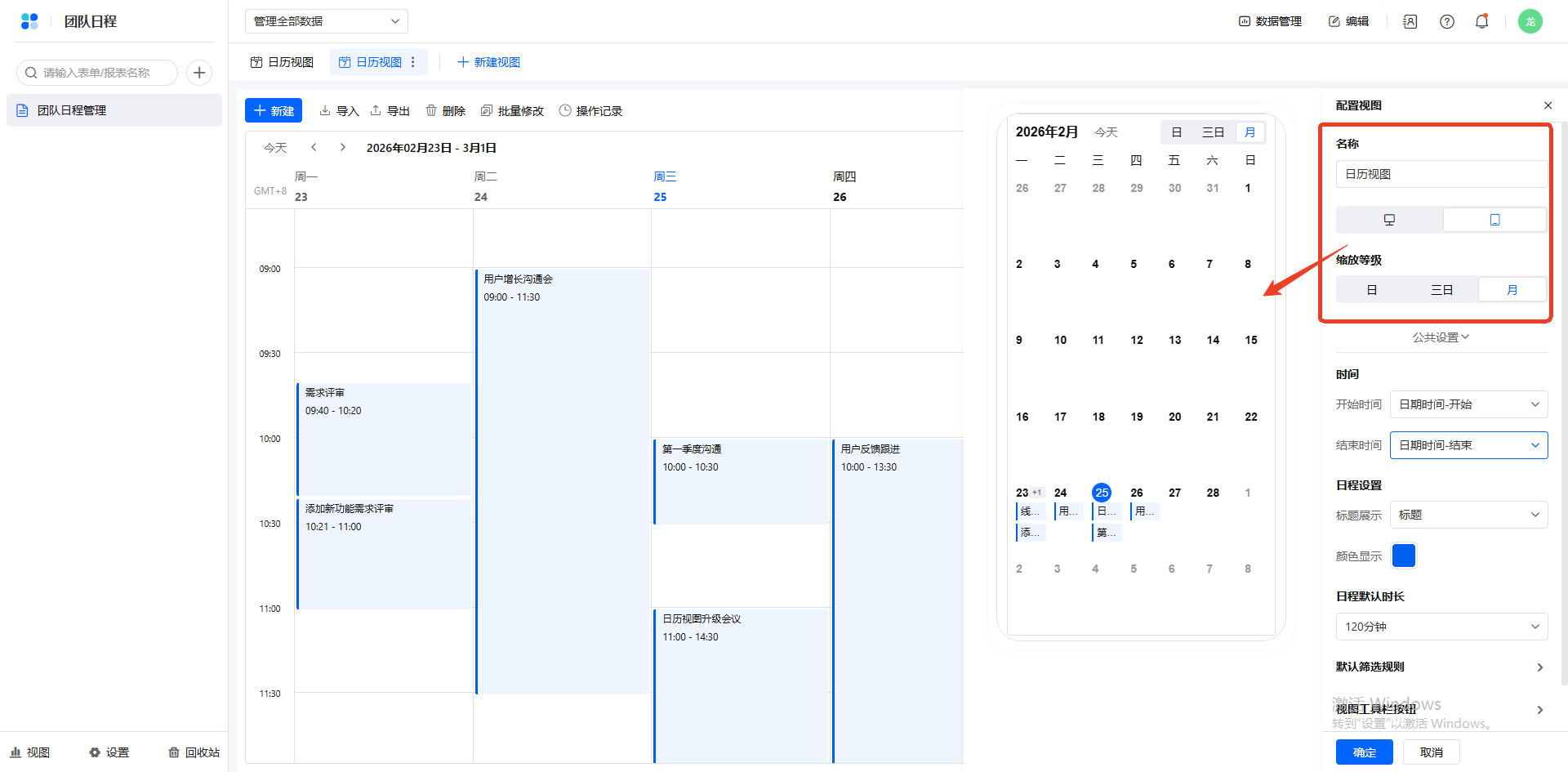 时间显示维度:在视图配置设置缩放等级,还可以在右上角切换日历的显示维度,可选项为日、周和月。