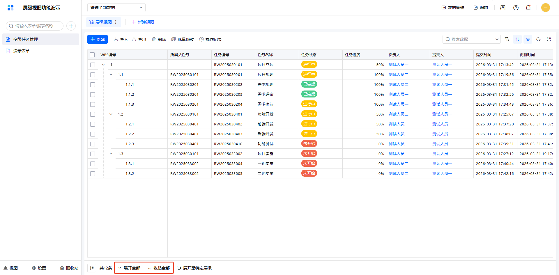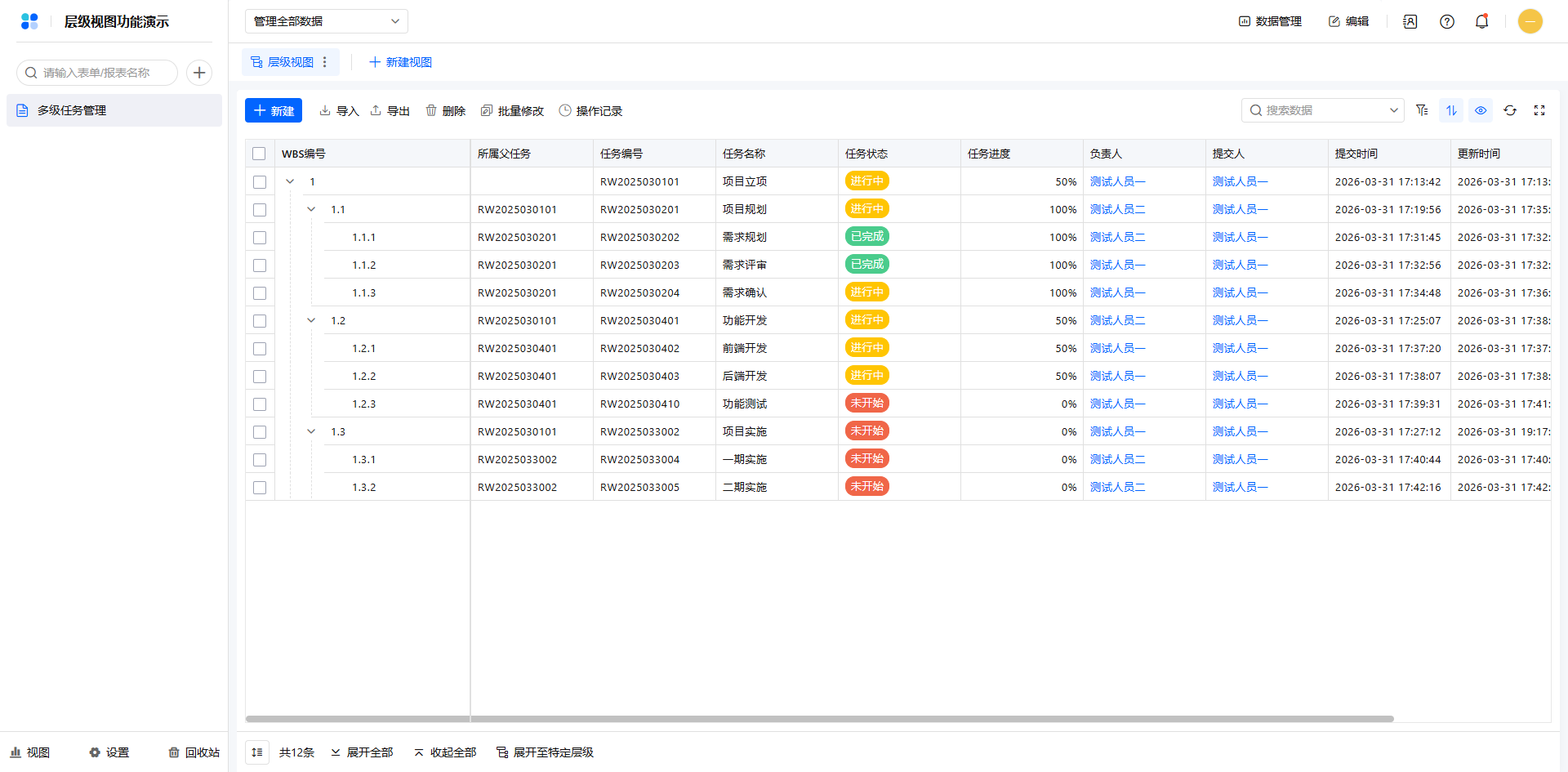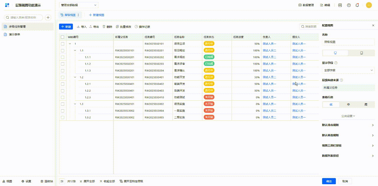 层级视图是指通过通过层级结构来展示具有父子关系的数据。在层级视图中,数据通常被分为多个层级或者分支,企业可以根据自身需求按照层级展开/折叠来查看数据的不同层级。在复杂业务场景下,帮助用户厘清数据间的关系和结构。
