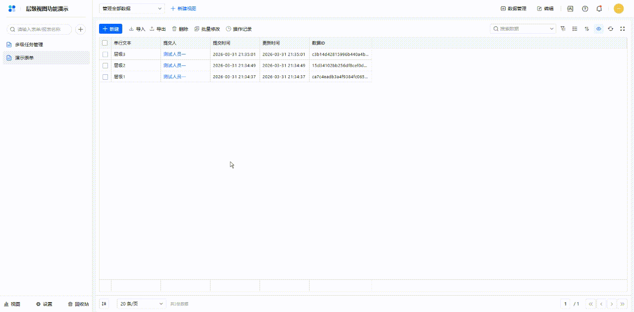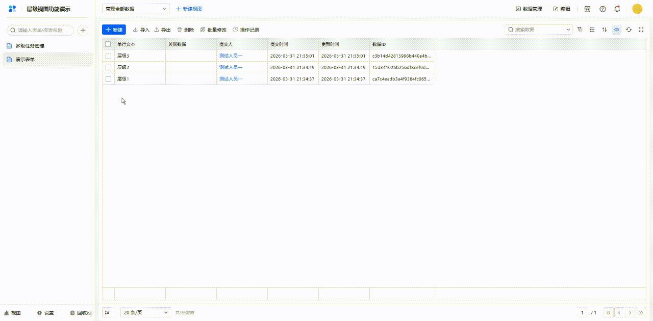 创建层级视图前,需确保当前表单内已通过关联数据字段,构建了 本表关联(用于构建出表单数据间的层级关系)。构建完成后,层级视图才可展示出该类关系。
