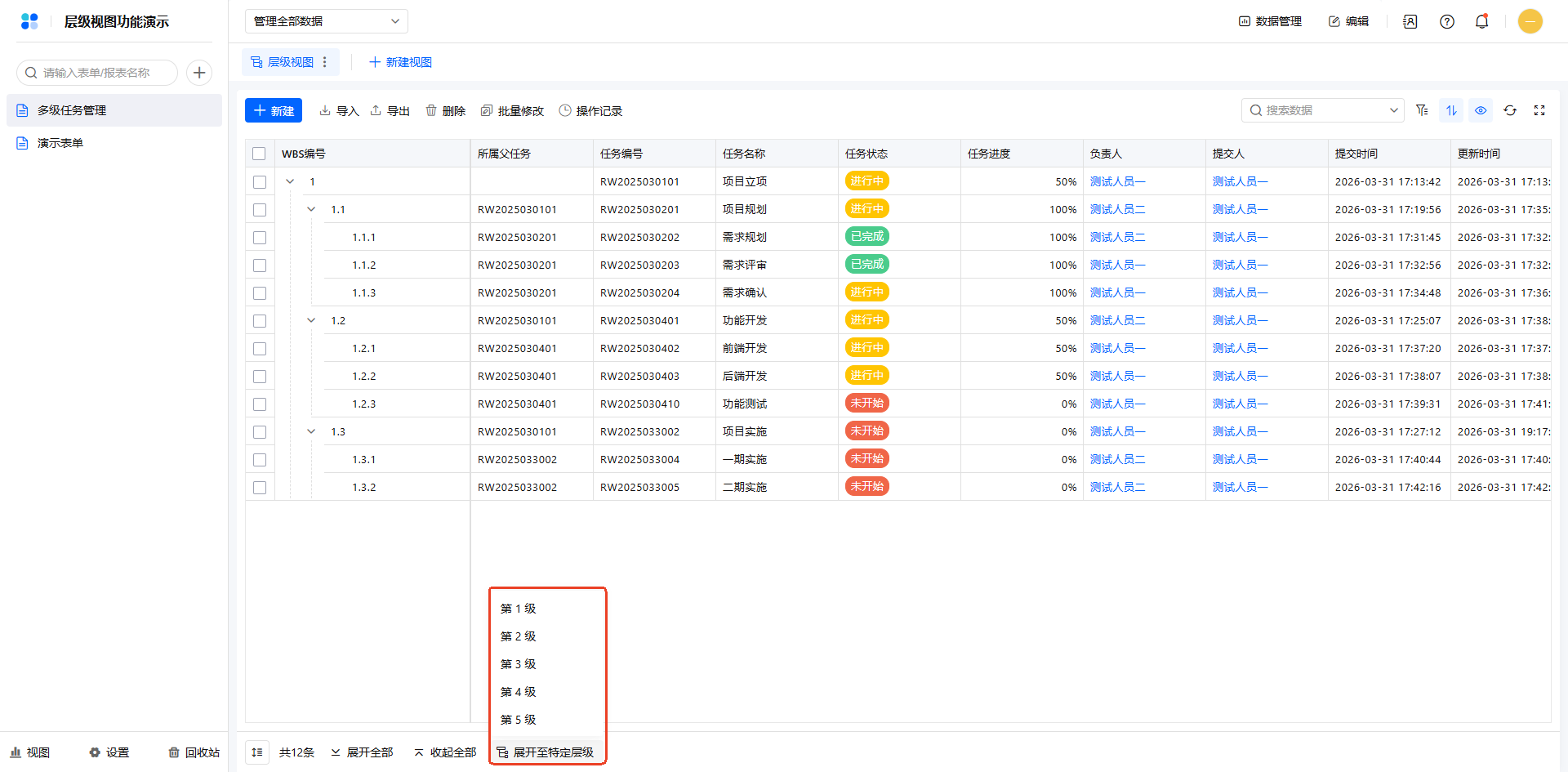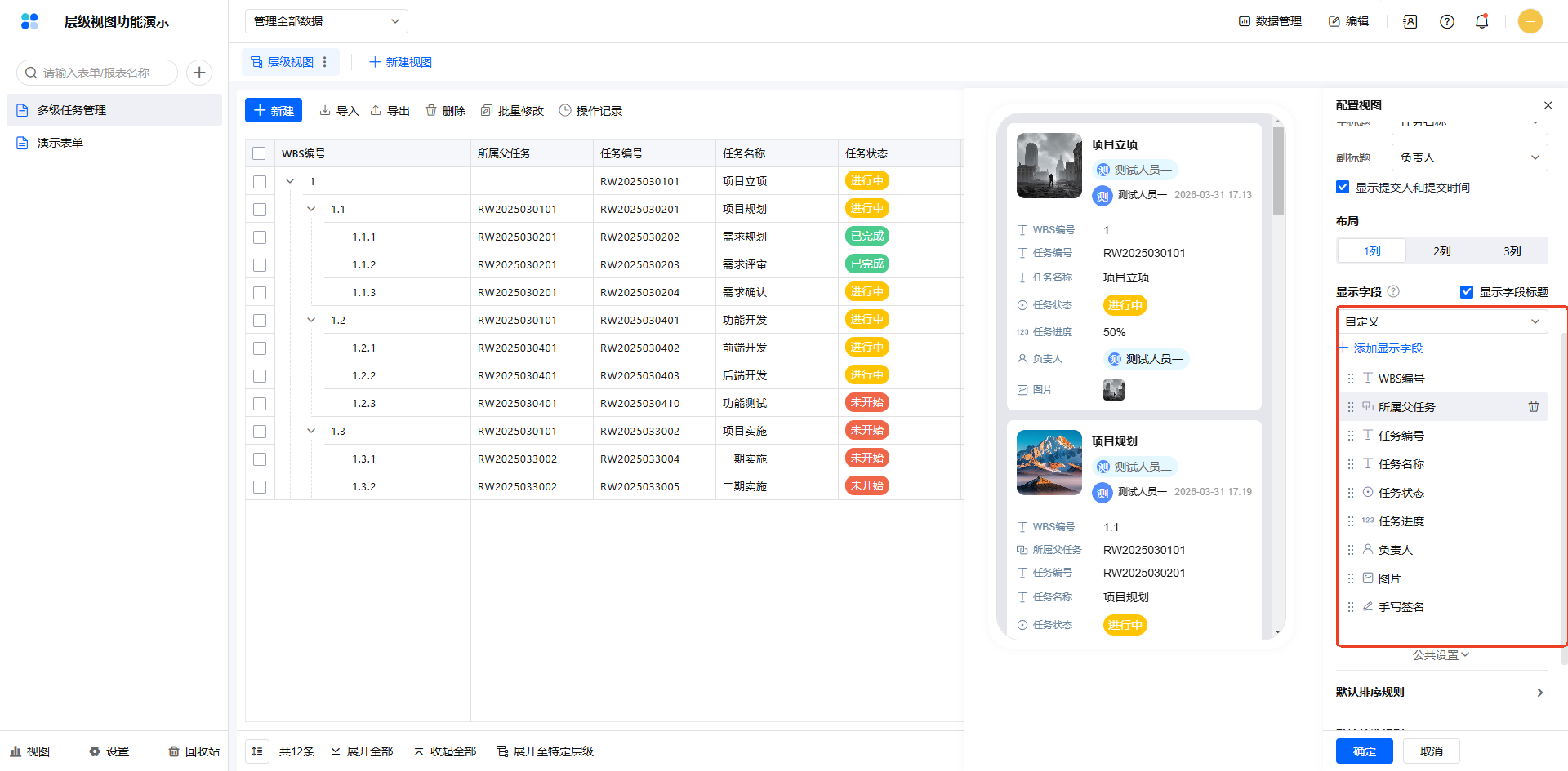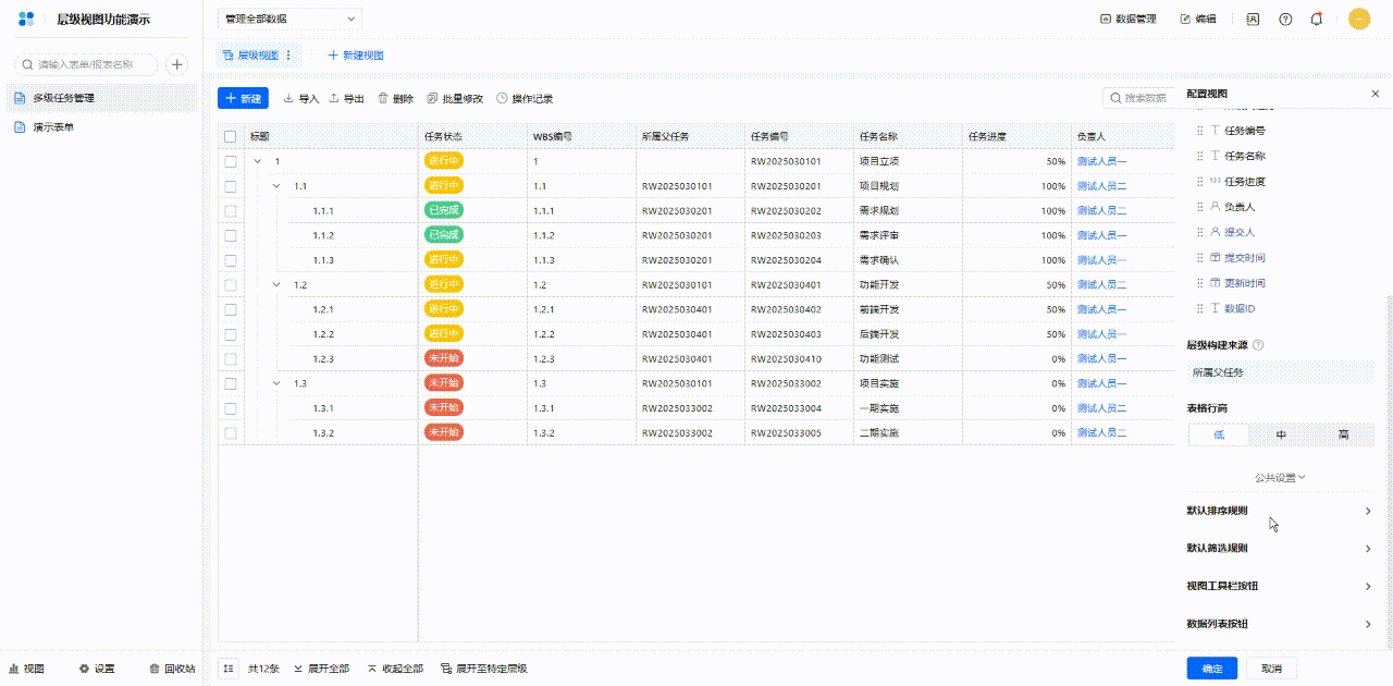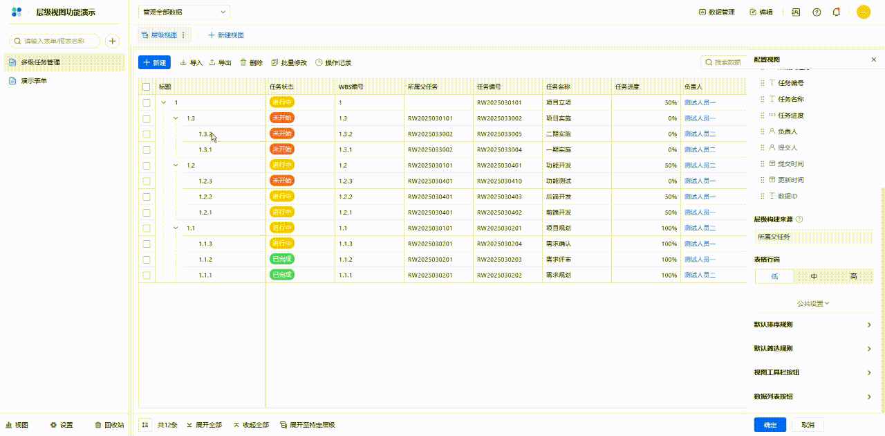 1)以在子任务表中设置层级视图为例,效果如下所示: