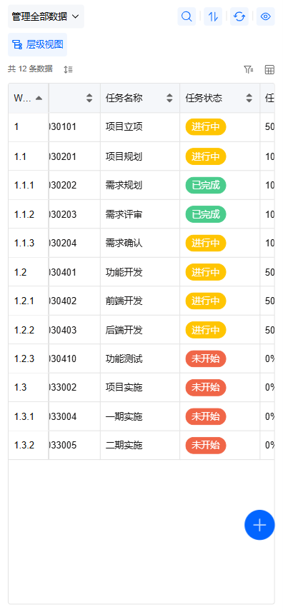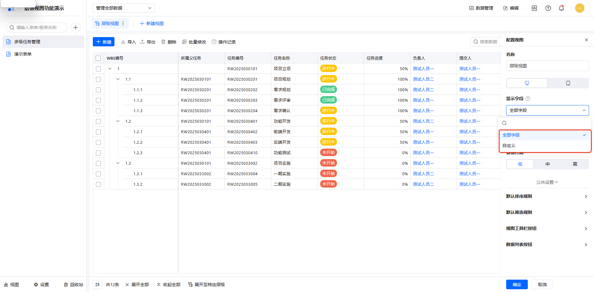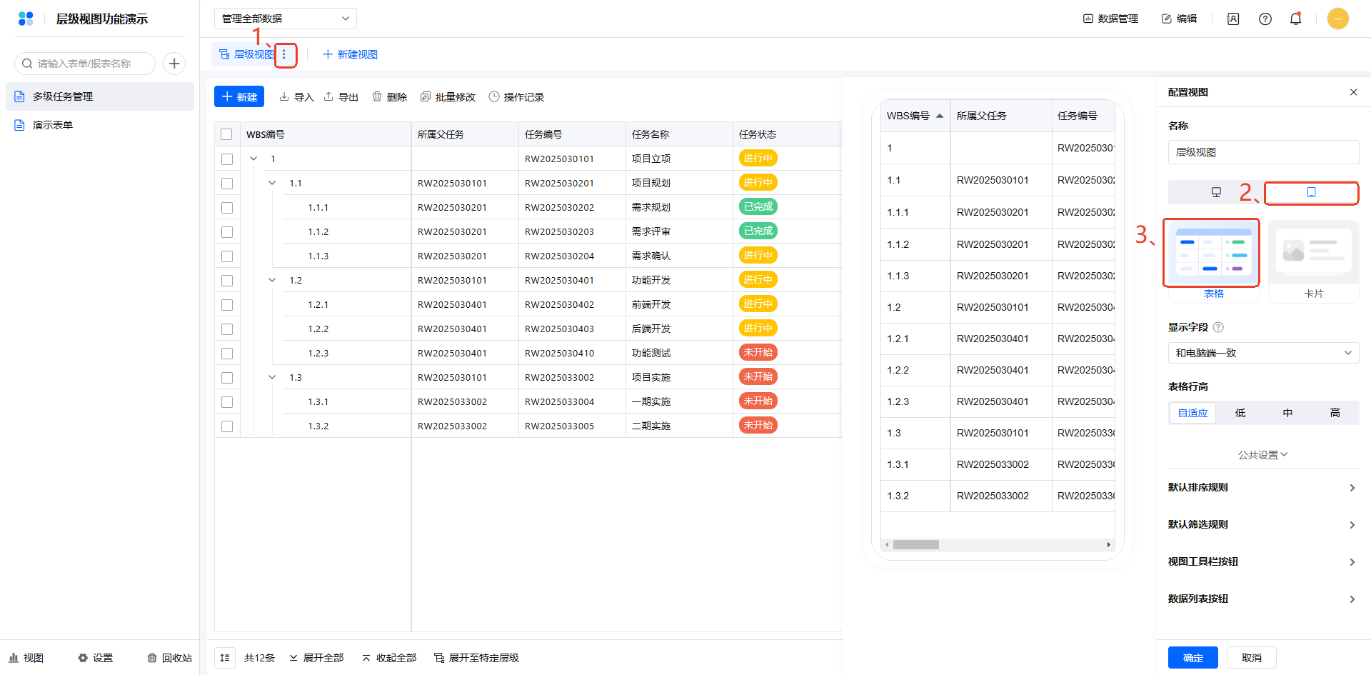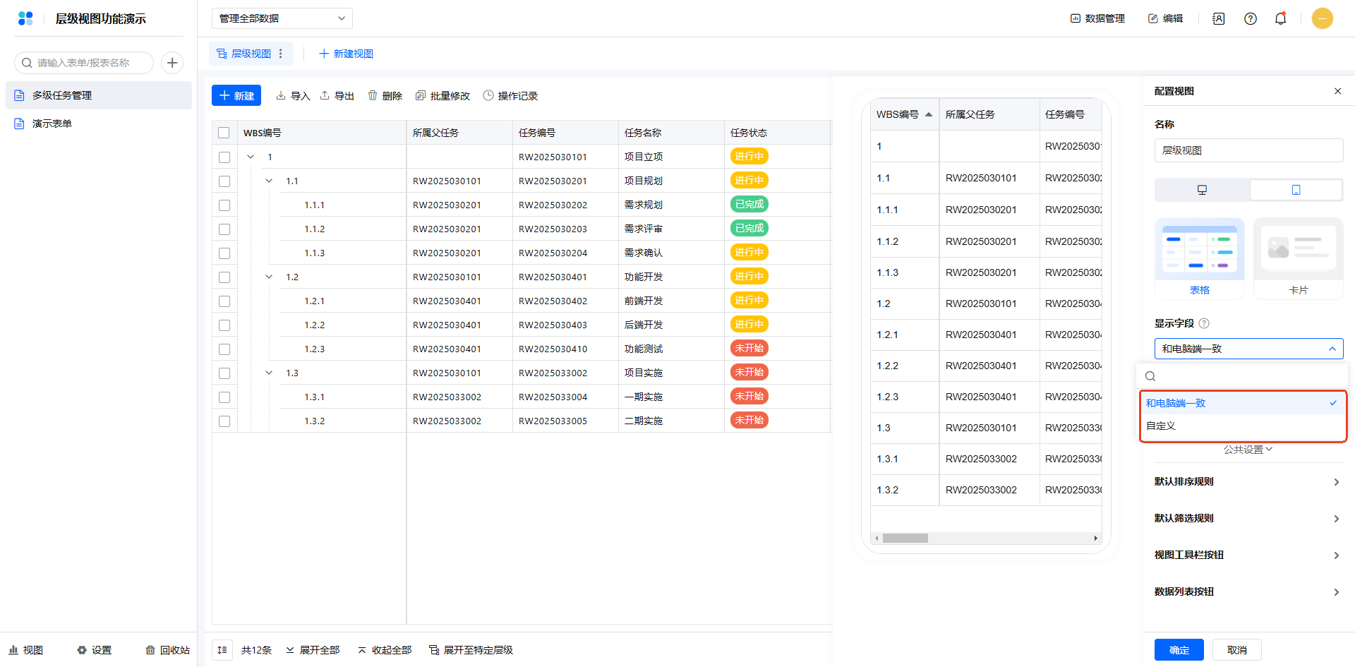 1)以在子任务表中设置层级视图为例,效果如下所示: