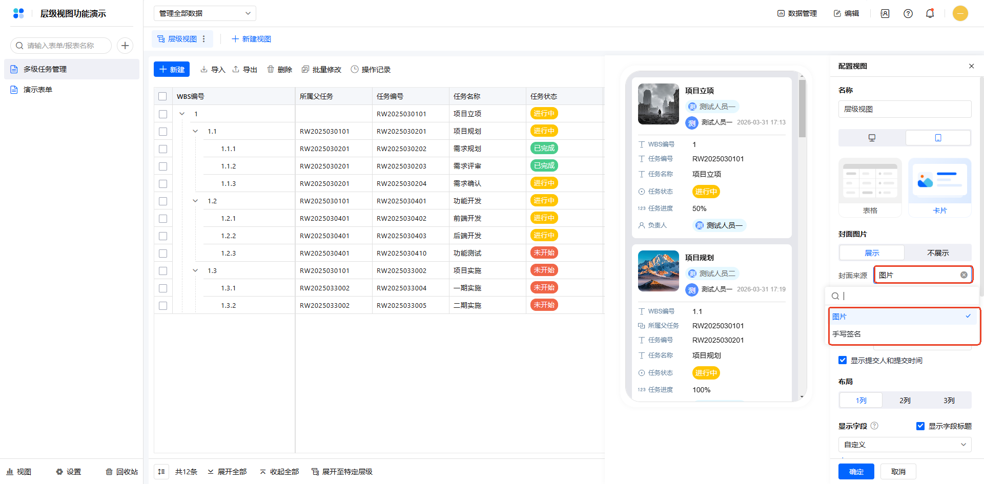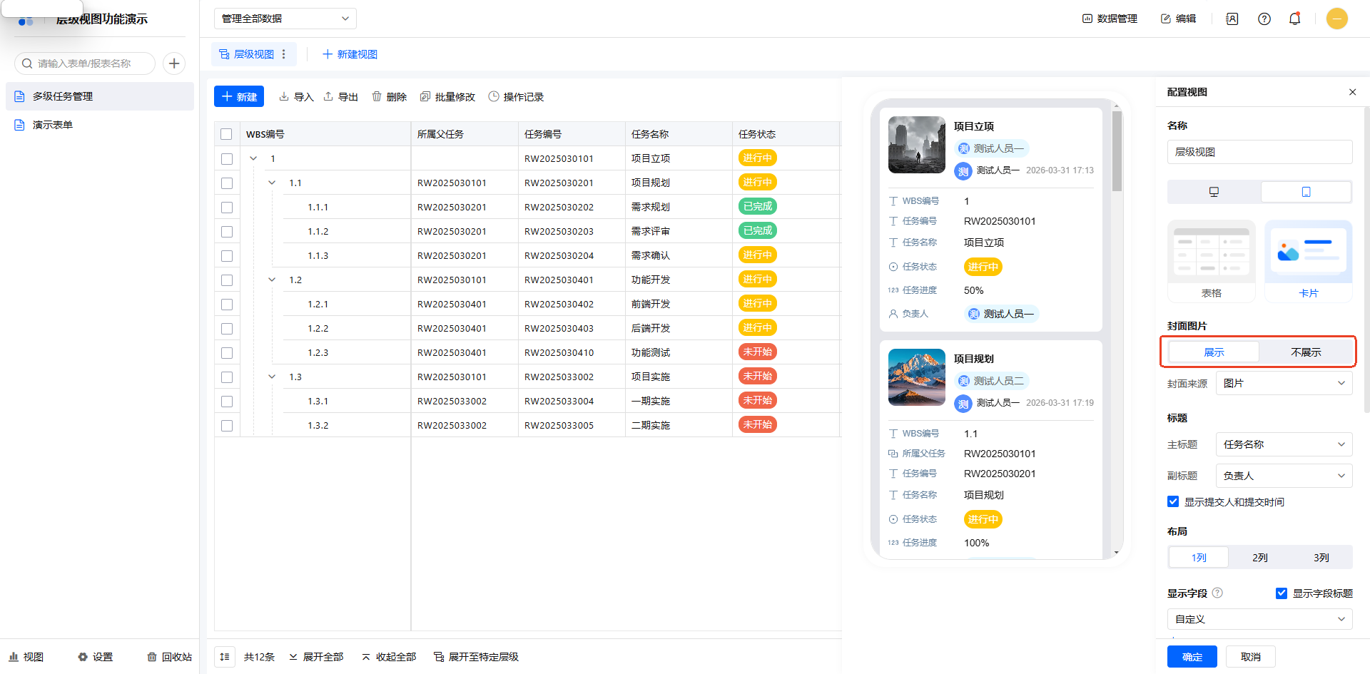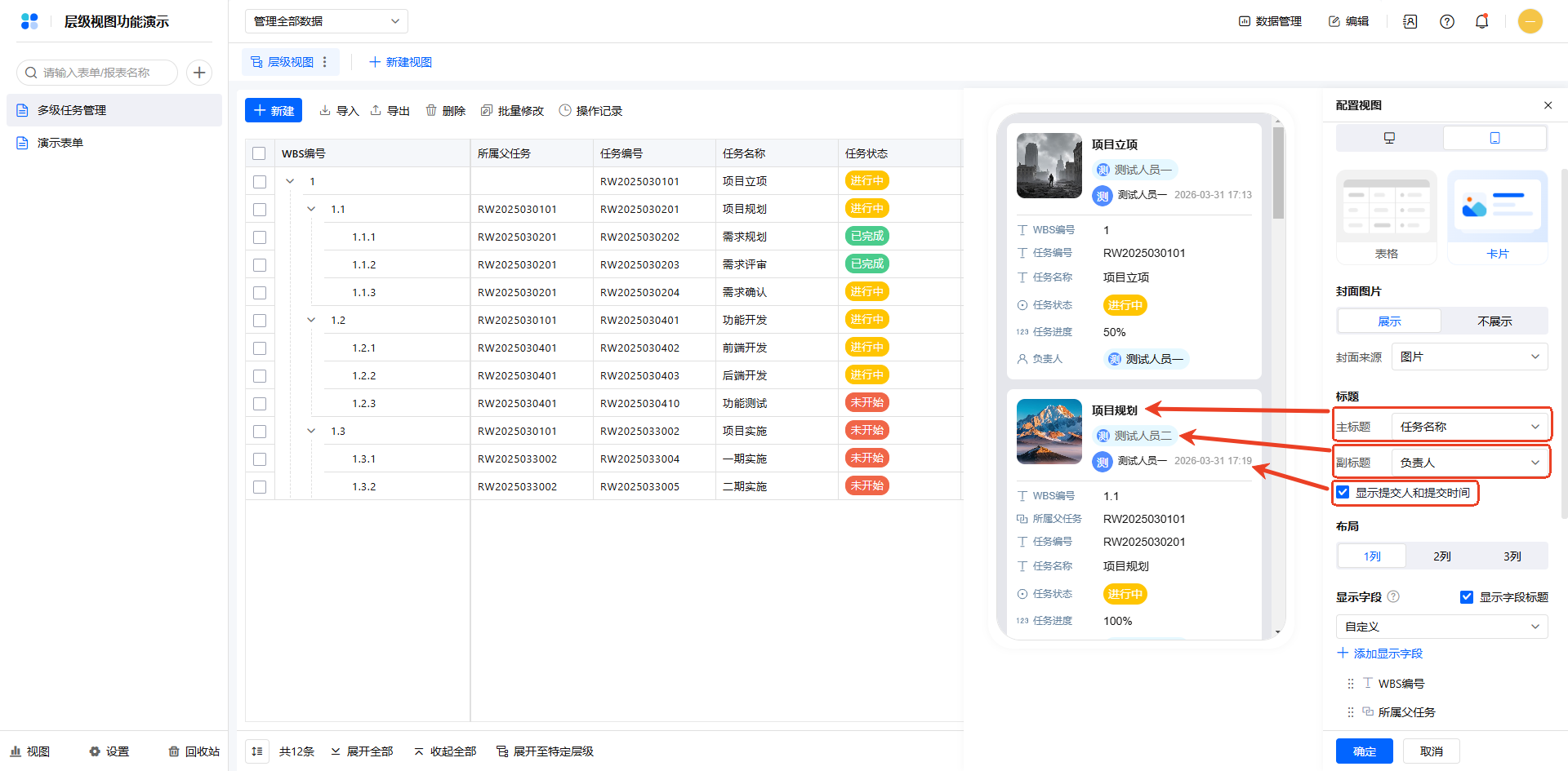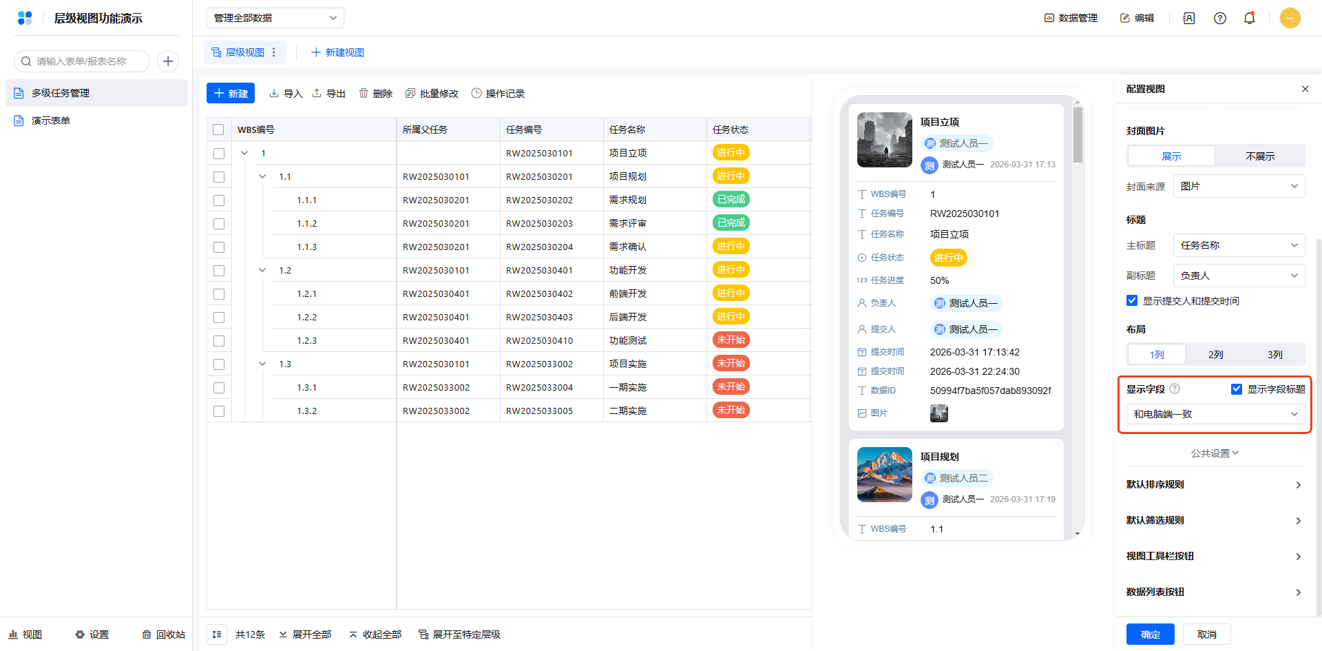 1)以在子任务表中设置层级视图为例,效果如下所示: