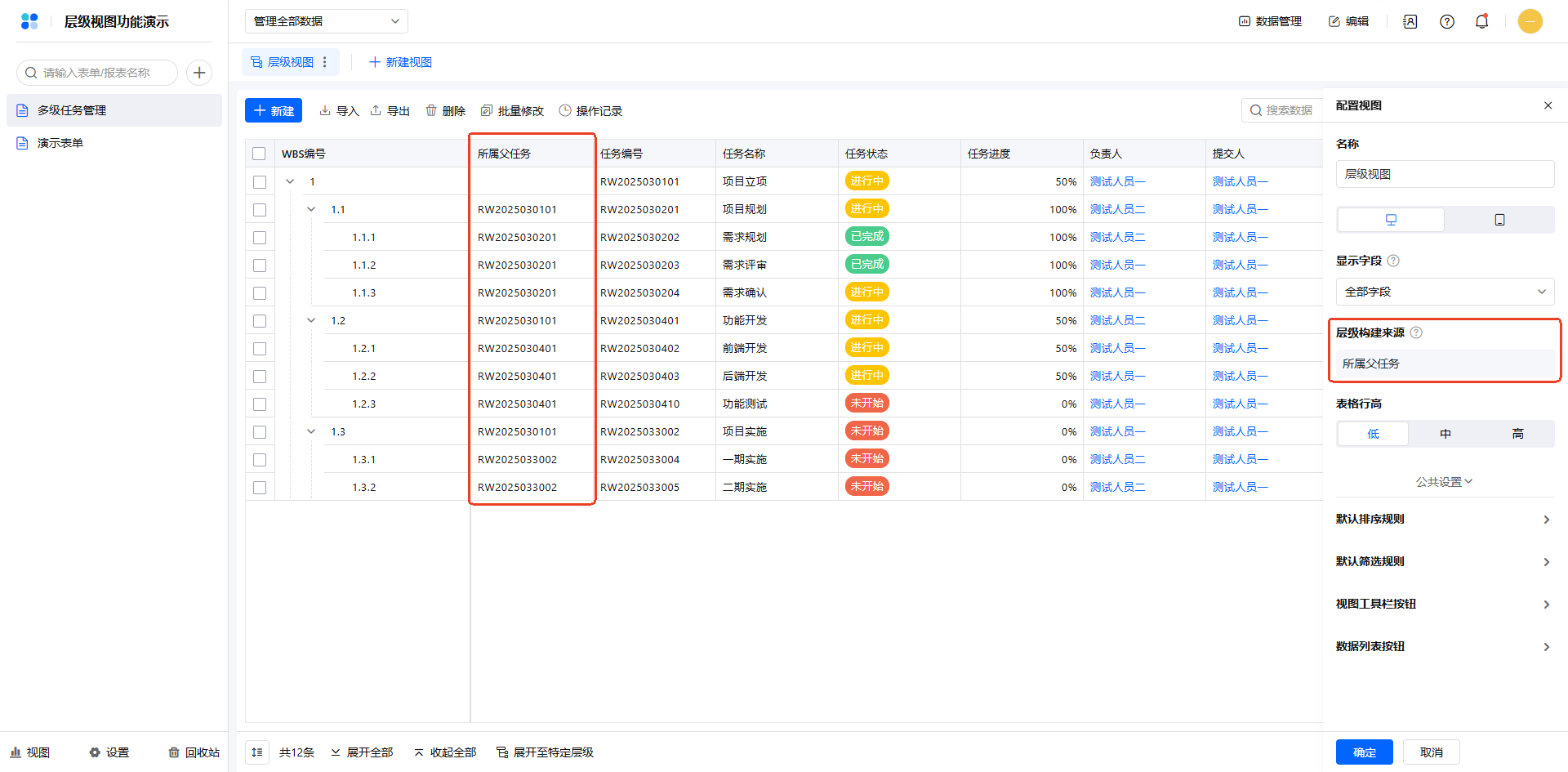 如子任务表中「所属父任务」的字段类型为「关联数据」,则层级的构建来源默认为「所属父任务」。如下所示: