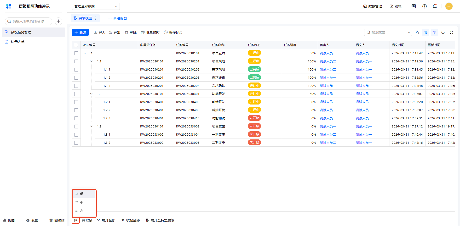 层级视图的表格行高支持低、中、高 3 种行高样式;