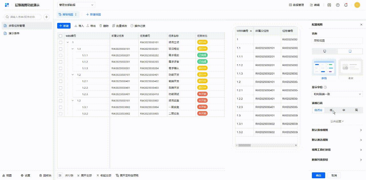 层级视图的表格行高支持低、中、高 3 种行高样式,在左侧预览界面可以看到预期效果:
