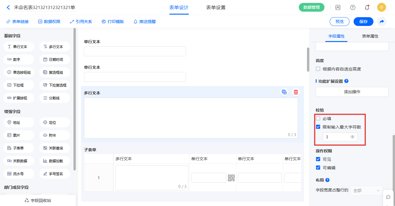 - 如果“多行文本”属于子表单内的控件,则无法设置此属性。